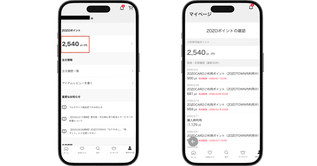 結論から言うと、ZOZOポイントの有効期限はマイページの登録情報から確認できます。