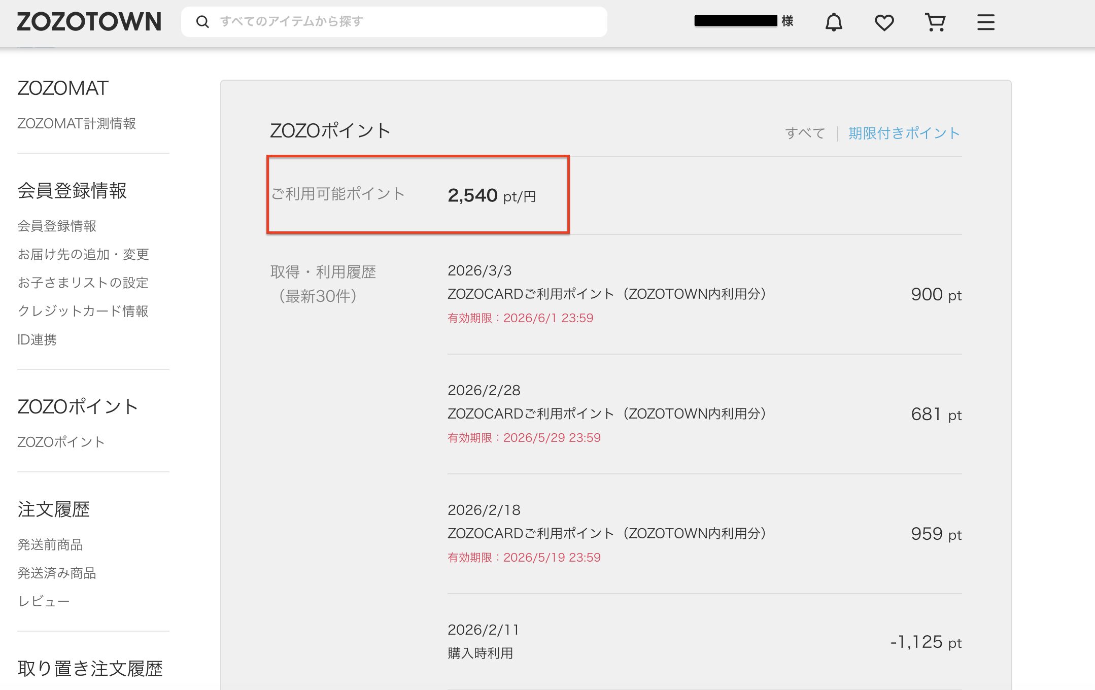 - 左サイドメニューの「ZOZOポイント」をクリック